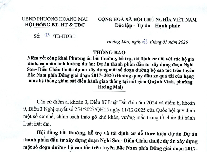 Thông báo niêm yết công khai phương án bồi thường, hỗ trợ, tái định cư đối với các hộ gia đình, cá...