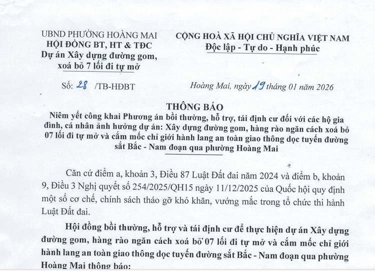 THÔNG BÁO: Niêm yết công khai Phương án bồi thường, hỗ trợ, tái định cư đối với các hộ gia đình, cá...
